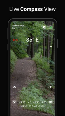 **Digital Compass** opremljen je nizom moćnih značajki dizajniranih za vrhunsku preciznost. Lako odredite svoj smjer koristeći azimut, ležaj ili stupnjeve, dok istovremeno pregledavate zemljopisnu dužinu, širinu, adresu i nadmorsku visinu. Praćenje jačine magnetskog polja i prikaz kuta nagiba terena dodaju sloj sigurnosti i svjesnosti o okolini, idealno za terenske uvjete. S inovativnim AR načinom rada, podaci kompasa projiciraju se na prikaz vaše kamere, pružajući intuitivno navigacijsko iskustvo. U realnom vremenu pratite status točnosti i aktivnost senzora, uz mogućnost prilagodbe postavki za tradicionalni doživljaj magnetskog kompasa.
