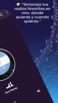 Očekuje vas raznolikost programa za svaki ukus: od glazbenih postaja s regionalnom glazbom, tangom, folkom, rockom i reggaetonom, do najnovijih vijesti iz cijele Argentine. Pratite sportske prijenose uživo, uživajte u satima komedije ili se povežite s vjerskim i kulturnim sadržajem. Prijenos je stabilan i kristalno čist, omogućujući vam da pauzirate i nastavite slušanje u bilo kojem trenutku. Aplikacija besprijekorno radi u pozadini, što znači da vaša omiljena glazba ili emisija ne prestaje ni kada koristite druge aplikacije ili zaključate zaslon. Za odabrane postaje, uživo ćete vidjeti informacije o izvođaču i nazivu pjesme.