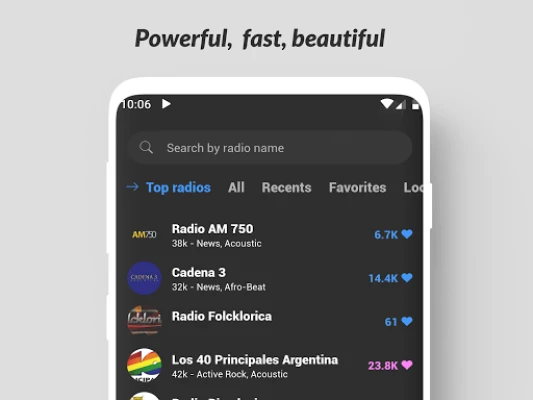 Radio Argentina je dizajnirana da obogati vaše svakodnevne trenutke. Uživajte u slušanju u pozadini dok multitaskingirate, istražujete internet ili koristite druge aplikacije. Brzo pronađite željene postaje uz intuitivnu funkciju pretraživanja. Prilagodite sučelje svom raspoloženju odabirom između elegantnog dnevnog ili tamnog noćnog načina rada. Započnite dan uz omiljenu glazbu ili vijesti zahvaljujući ugrađenoj funkciji budilice koja vas nježno budi uz zvuk vaše odabrane stanice.